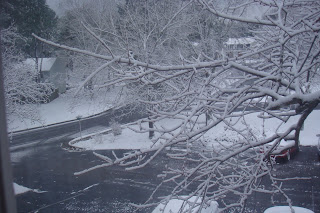 Then, last night we had more excitement in the form of SNOW! Last year, it didn’t really snow at all here in NC, and the one time it has snowed so far this year I was in Georgia. It was definitely in the forecast to snow, but I have heard that before and been sorely disappointed when it didn’t reach this area. I wasn’t disappointed this time though! Outside it is a winter wonderland! I’m sure that by this afternoon it will all be a slushy mess, but for now it’s really pretty out, so I will also post a few pics of that. The first is last night when it was still coming down, and the second is this morning. Notice they are both taken from inside the house, haha. Need to get out and take some good ones.