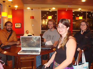 In this photo: (L to R by NaNo username) magiuspendragon, Rai Yan (our fearless ML), thegreekparvula, and lynoir. Great group of people! I had fun hanging out with you guys. (**Sidenote: Notice the purple pen on the table in the left corner of the photo? Oh yeah, one of my 12,500 word NaNo rewards! Love it!)