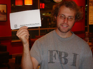 In this photo: Rai Yan, the Raleigh area ML, holds up his beautiful sign, letting NaNo participants everywhere know we mean business. (**Sidenote: No, Rai Yan does NOT work for the FBI. I asked.)