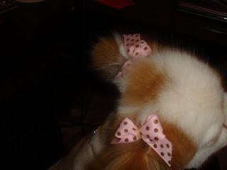 When I saw her it was like the sun peeking through the clouds after weeks of rain. She was a new dog! I had them shave her again, like I did a couple times before ( according to their computers, it was november ’08 the last time I took her in – what? bad mommie!). They even put these super cute pink and brown bows in her hair:Of course they are no longer in there. The bows are always the first thing to go.