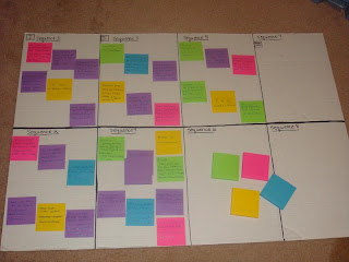 It isn’t quite finished, as you can see in those last three sequences, but it’s getting there. I have used five different colors of post-it notes for this novel. Each color is for a different POV since this is sort of an ensemble cast piece. Pink = the witch; Purple = my heroine, Parrish Sorrows; Blue = the hero, Noah Vincent; Yellow = Any official news or announcement about the virus (CDC, News, Internet, etc); Green = Any other POV, which includes the Sorceress, the boy, Carmen, and Crash so far. I know those names don’t mean much to any of you, but to me it all makes sense :P.
