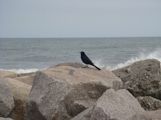And here’s a picture we took as we were leaving the aquarium. All smiles. After the aquarium, we walked along the beach. It was an overcast day, but it was still gorgeous out there. I took a picture of this black bird that was sitting on the rocks near us. I think it was looking at me. If you’ve read Bitter Demons, you’ll understand why this bird kind of freaked me out: