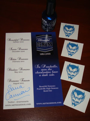 For starters, I designed some bookmarks with the following tagline: In Peachville, even the cheerleaders have a dark side. On the back, it lists the names of all five books in the series, along with the months they either were released or will be released. I also signed all the bookmarks. Yes, I realize the irony in giving away bookmarks for ebooks, but hopefully by the time SHADOW DEMONS comes out, there will be a print book out for all of the books as well!