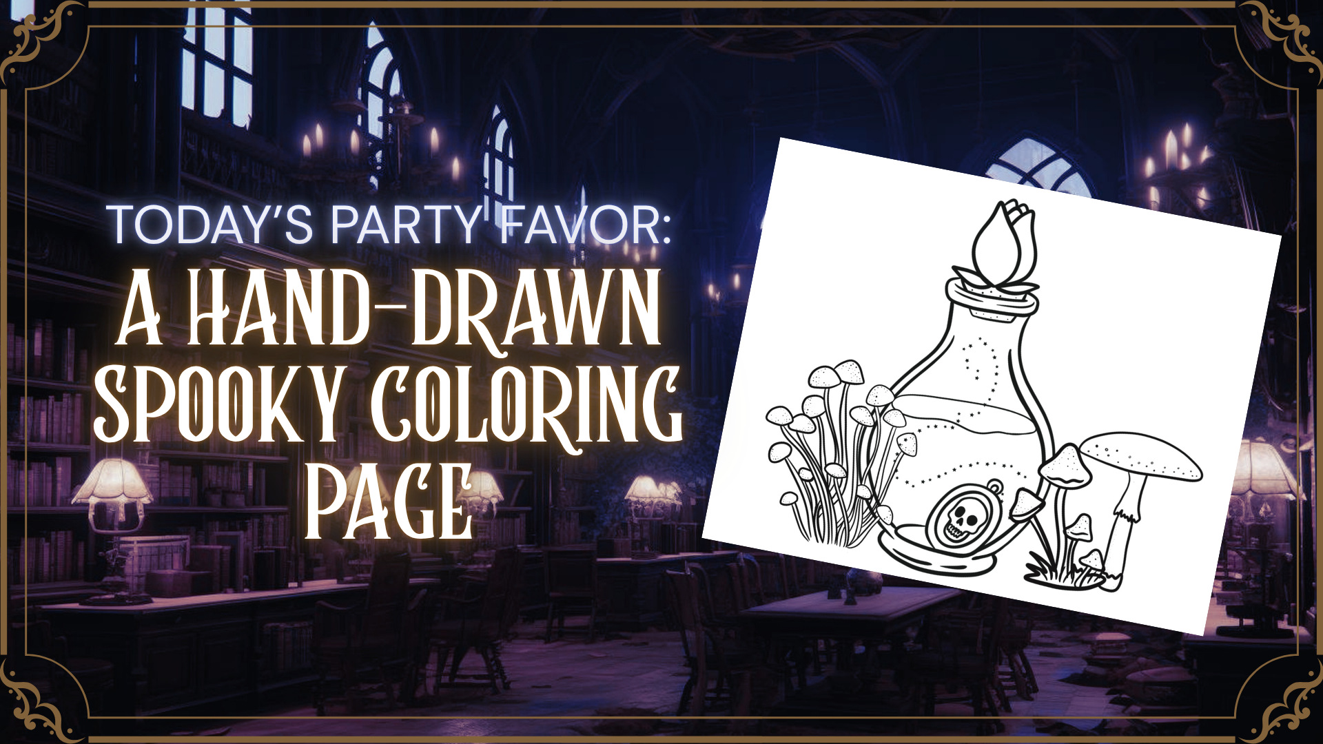 I couldn’t let you go without something creative to enjoy! Today’s party favor is a hand-drawn spooky coloring page, perfect for channeling your inner artist while we hang out during later’s watch party.